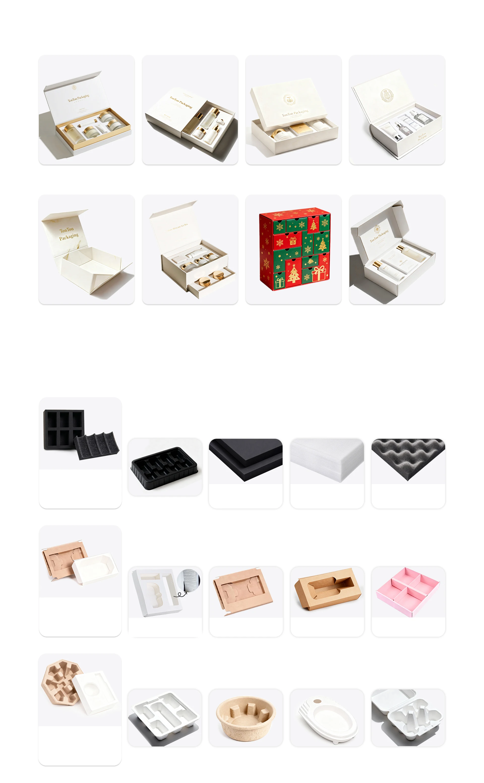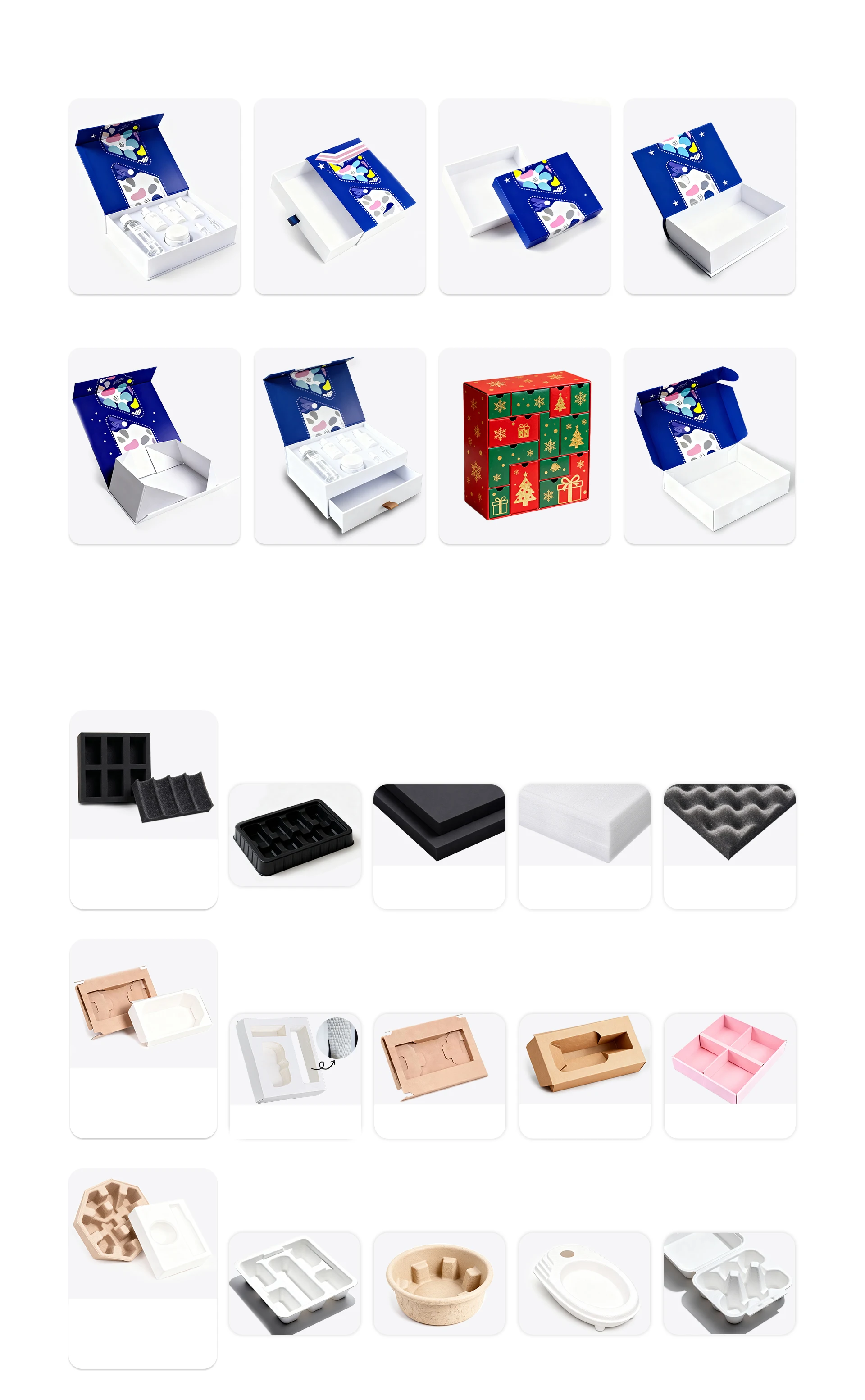 Box type classificationMake a statement with your rigid box - no matter the occasion! With endless gift box style options, you can createsomething truly special that stands out from the crowd.Magnetic BoxDrawer BoxLid and Base BoxBook Style BoxFoldable Gift BoxDouble-layer flip boxAdventCalendar boxShipping BoxA box insert for every productOur wide range of box insert options are designed to keep your products safe and looking their best. Choose fromfoam inserts, cardboard inserts or environmentally friendly alternatives - crafted for you.Foam Materials & Plastic traysFor common insert materials: EVA is recommended, balancing protection & aesthetics.Folding cardboard trayDeliver an exceptional unboxing experience with our inspiring selection of cardboard box inserts.telescopic trayNatural KraftCorrugated insertPaperboard insertNatural KraftFolding Carton BoxDivider insertsCardboard insertsProcessed Molded PulpNatural Dry molding MoldedPulp insertWet molding Molded PulpInsertsWhite Dry molding MoldedPulp insertMolded pulp inserts for every occassionBe fully sustainable with meticulously form-fitted molded pulp packaging.Paperboard and corrugated inserts to keep products in place.FoaminsertsHigh end foam inserts with high. impact absorption for delicate items.Molded Pulp InsertsBiodegradable box insert molded to the products with recycled material.EVARecyclable and lightweight durable foam with high level of shock absorption.High-density foam that offers optimal protection, support, and cushioning for products.EPEESDAnti-static foam primarily used for packaging electronic products.PET Blister InsertBox type classificationMake a statement with your rigid box - no matter the occasion! With endless gift box style options, you can createsomething truly special that stands out from the crowd.Magnetic BoxDrawer BoxLid and Base BoxBook Style BoxFoldable Gift BoxDouble-layer flip boxAdventCalendar boxShipping BoxA box insert for every productOur wide range of box insert options are designed to keep your products safe and looking their best. Choose fromfoam inserts, cardboard inserts or environmentally friendly alternatives - crafted for you.Foam Materials & Plastic traysFor common insert materials: EVA is recommended, balancing protection & aesthetics.Folding cardboard trayDeliver an exceptional unboxing experience with our inspiring selection of cardboard box inserts.telescopic trayNatural KraftCorrugated insertPaperboard insertNatural KraftFolding Carton BoxDivider insertsCardboard insertsProcessed Molded PulpNatural Dry molding MoldedPulp insertWet molding Molded PulpInsertsWhite Dry molding MoldedPulp insertMolded pulp inserts for every occassionBe fully sustainable with meticulously form-fitted molded pulp packaging.Paperboard and corrugated inserts to keep products in place.FoaminsertsHigh end foam inserts with high. impact absorption for delicate items.Molded Pulp InsertsBiodegradable box insert molded to the products with recycled material.EVARecyclable and lightweight durable foam with high level of shock absorption.High-density foam that offers optimal protection, support, and cushioning for products.EPEESDAnti-static foam primarily used for packaging electronic products.PET Blister Insert